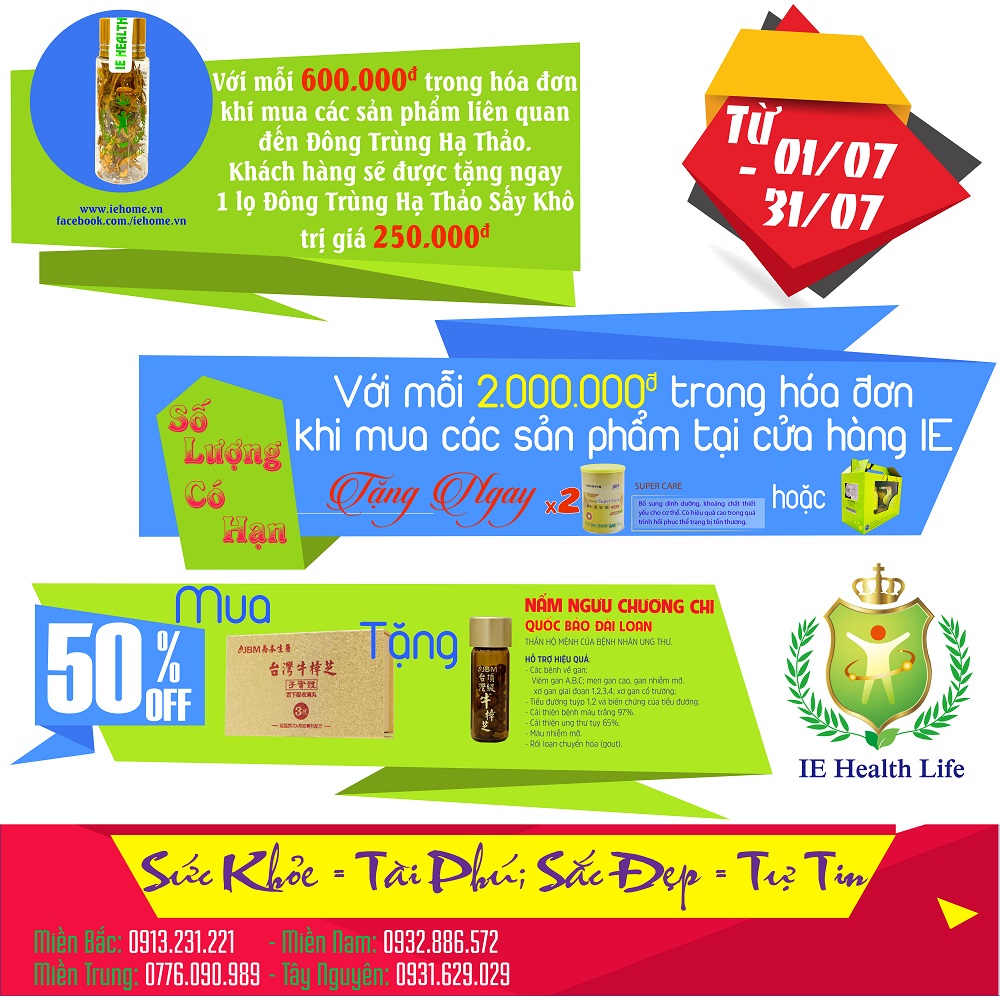- Khi khách hàng tiêu dùng tất cả các sản phẩm tại cửa hàng IE với tổng hóa đơn từ 2 triệu đồng sẽ được tặng 1 trong 2 sản phẩm (1 cặp Trùng Thảo Rượu (2 lọ) hoặc 2 hộp Supper Care).
