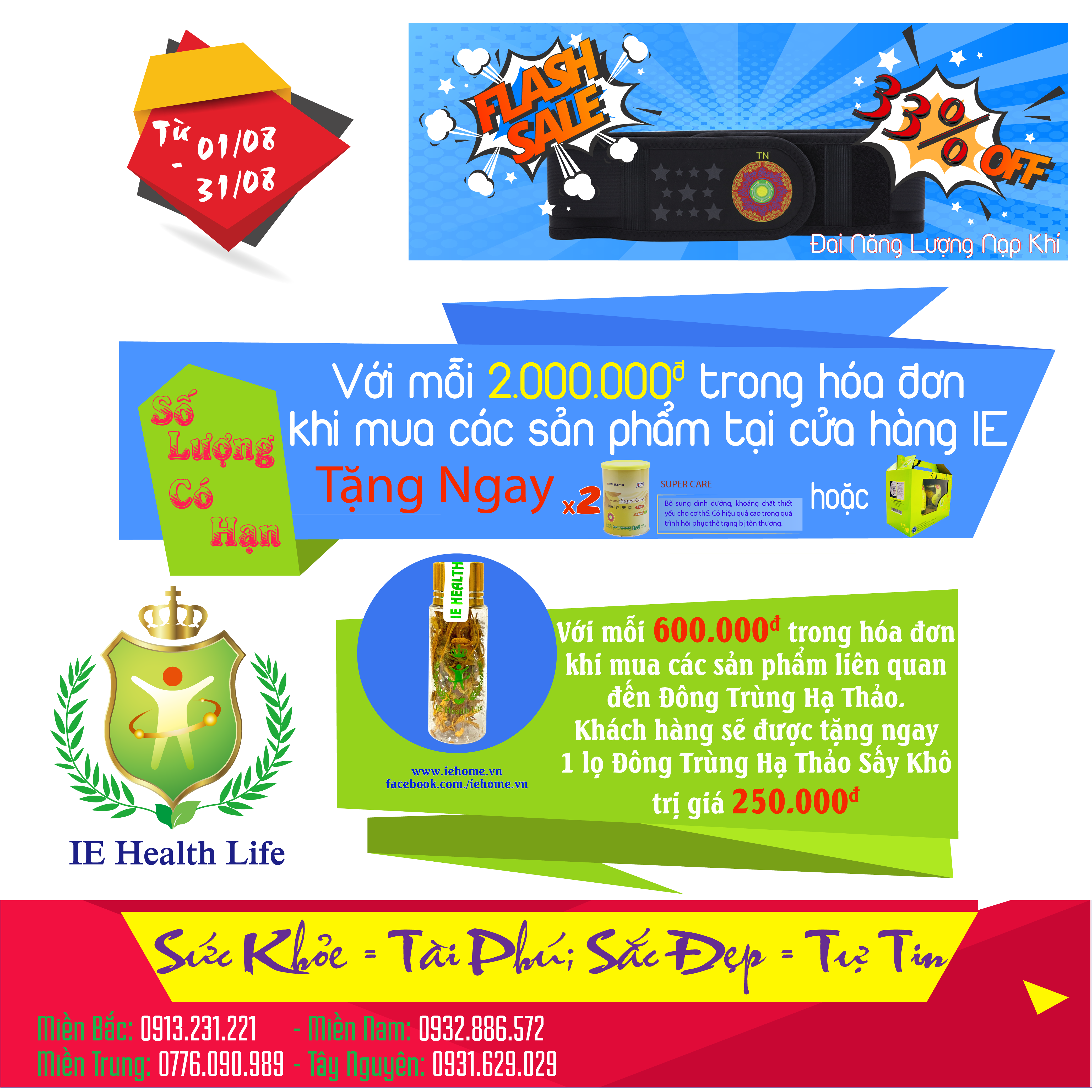 - Khi khách hàng tiêu dùng tất cả các sản phẩm tại cửa hàng IE với tổng hóa đơn từ 2 triệu đồng sẽ được tặng 1 trong 2 sản phẩm (1 cặp Trùng Thảo Rượu (2 lọ) hoặc 2 hộp Supper Care).