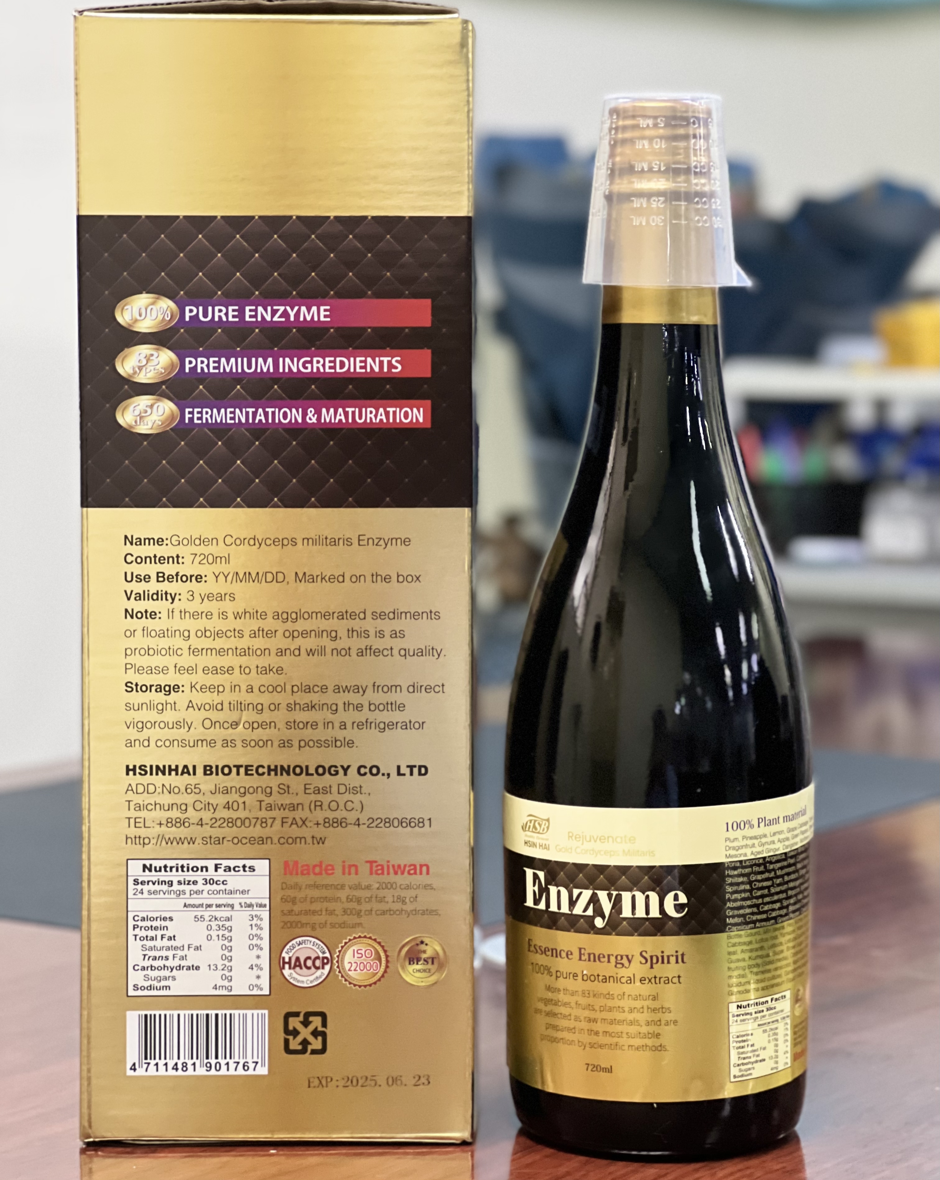 Enzyme Trùng Thảo (Golden Cordyceps Militaris Enzyme) là một sản phẩm dinh dưỡng cao cấp được sản xuất từ 100% enzyme nguyên chất của 83 loại thực vật cao cấp và nấm đông trùng hạ thảo. Sản phẩm này là kết quả của quá trình lên men kéo dài 650 ngày và đã được kiểm chứng về tính hiệu quả và an toàn giúp tăng cường sức khỏe và chống lại các bệnh lý. Đặc biệt, nấm đông trùng hạ thảo được coi là một trong những loại thực phẩm chức năng có tác dụng tăng cường miễn dịch và chống oxy hóa.