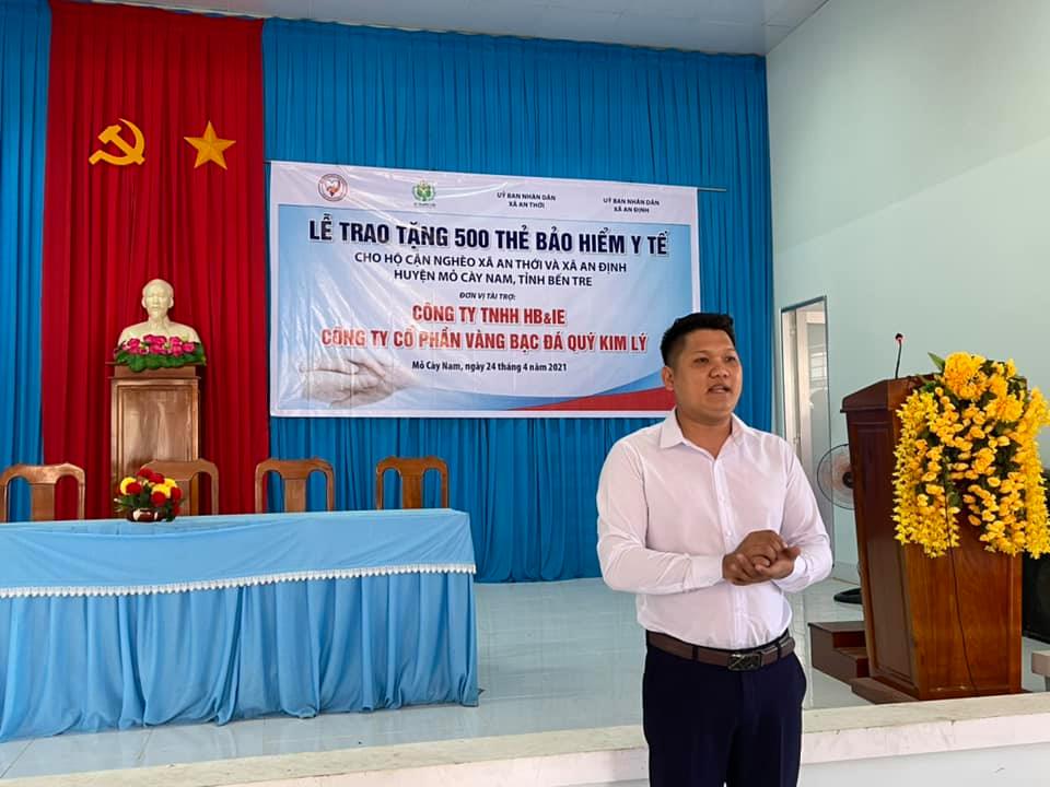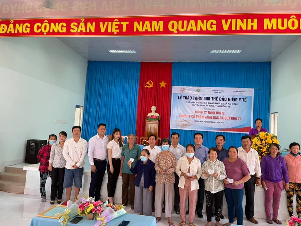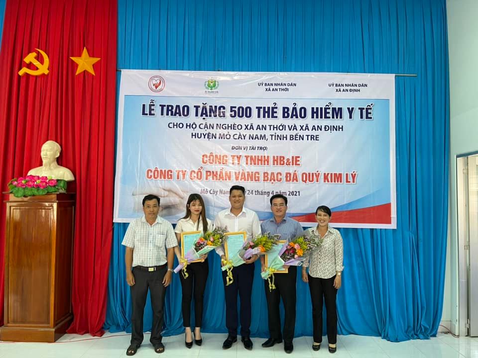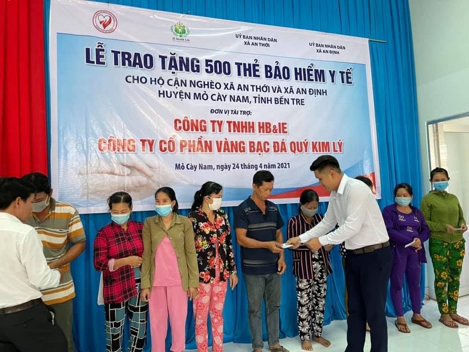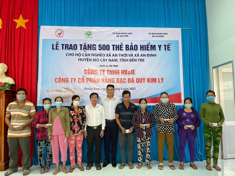 Nhằm chung tay với cộng đồng để chăm sóc sức khỏe cho người dân, đặc biệt là các hộ có hoàn cảnh khó khăn không có khả năng chi trả chi phí khám, chữa bệnh. Công ty TNHH HB&IE, Công ty cổ phần vàng bạc đá quý Kim Lý và Hội Bảo Trợ Bệnh Nhân Nghèo Tp.HCM sẽ trao tặng 500 thẻ BHYT cho hộ cận nghèo xã An Thới và An Định huyện Mỏ Cày Nam, tỉnh Bến Tre vào ngày 24.04.2021.